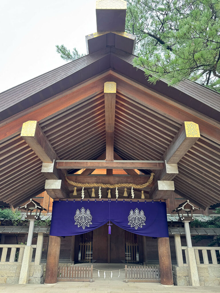 As you walk down the approach, you will find a panel exhibition tracing 1,900 years of history and mythology, which is well worth seeing. Passing through the torii gate, the main shrine (Hongu) comes into view. The roof features sword-like wooden beams called chigi and golden logs called katsuogi, a style known as Shinmei-zukuri, which is the same as the Ise Grand Shrine. The enshrined deity is Atsuta-no-Okami, and the Kusanagi sword is worshipped here as an avatar of the sun goddess Amaterasu.