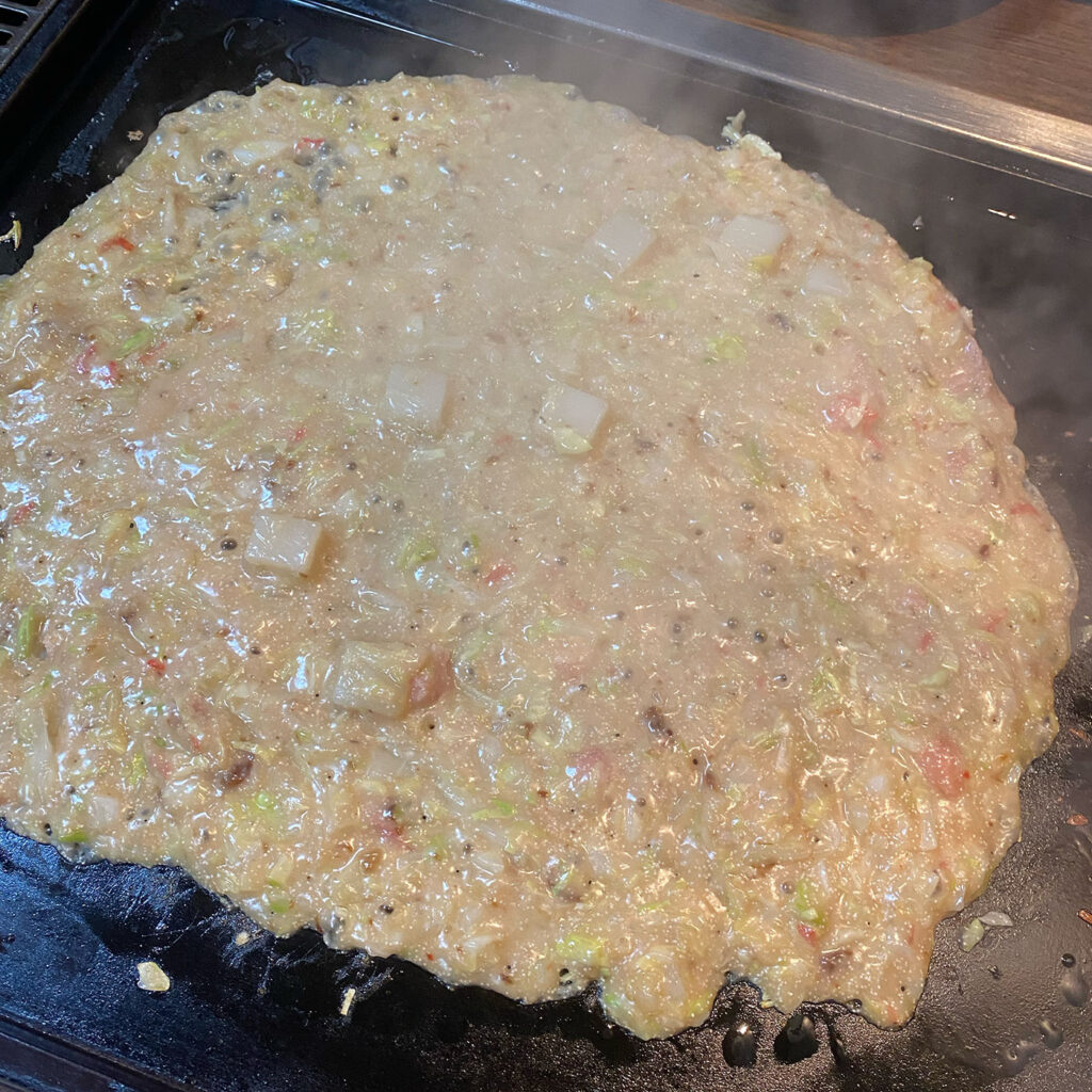 Monjayaki is made by pouring a thin batter made from wheat flour onto a hot plate, cooking it, and scraping the browned parts with a small spatula called a teppan spatula (teko) to eat.